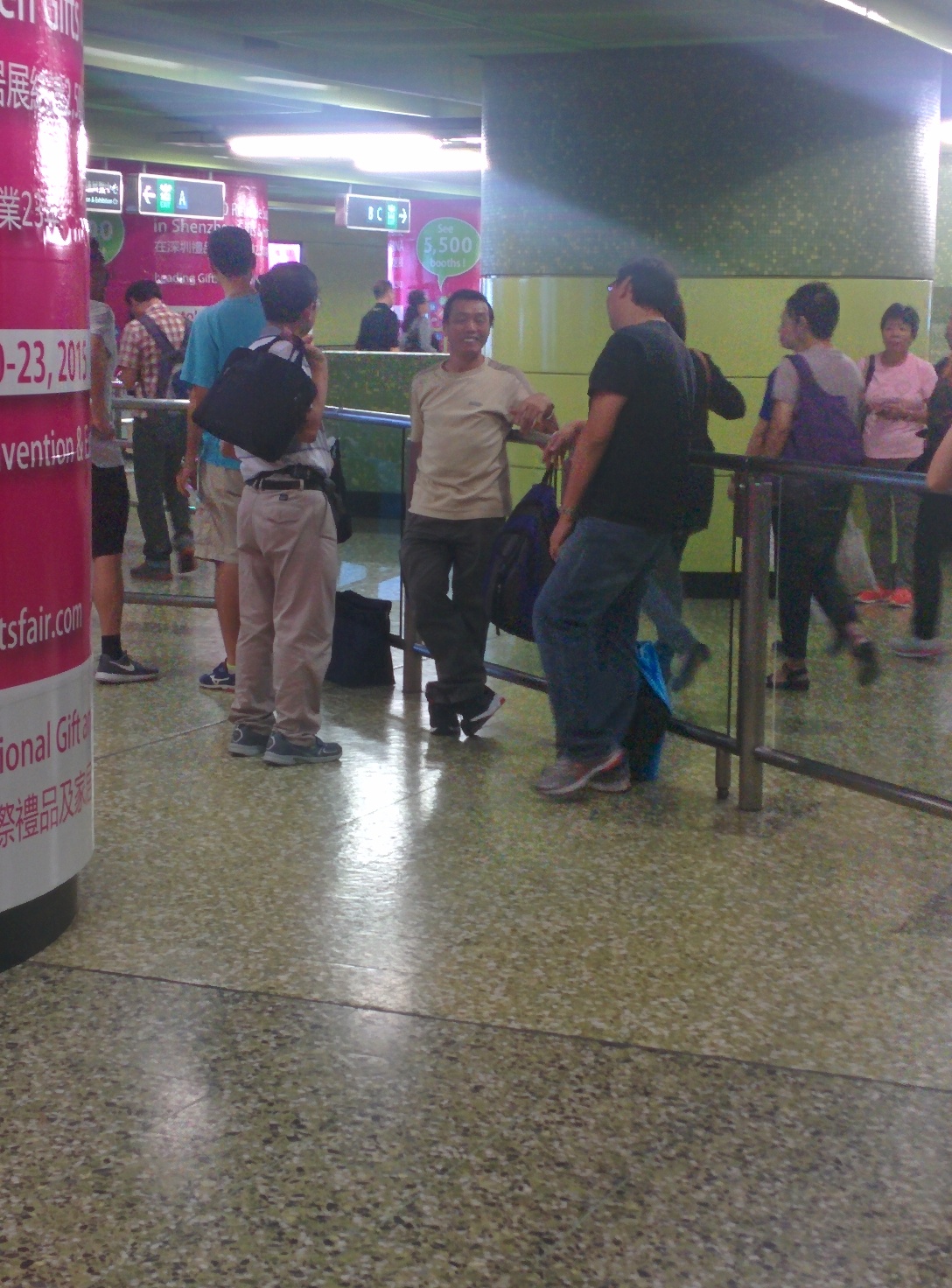 All stations have miles of shiny metal rails here, guiding everyone like business casual hamsters in a maze. I noticed a small crowd hanging around these rails, chewing the fat without a care. Not bad idea, I thought, free wifi, a lack of sweating etc. It irked me though that they were standing either side of the rail. Why? A 10 metre walk lead them directly to each other. There were also others, waiting alone, no riveting conversation for them.